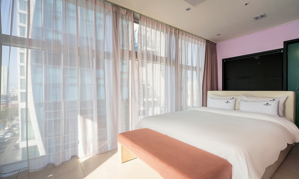 2면이 통창으로 설계된 구조로 채광과 전망이 우수하며, 넓은 실내 공간과 퀸 사이즈 침대 1개, 샤워부스를 갖추고 있습니다.