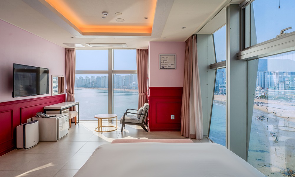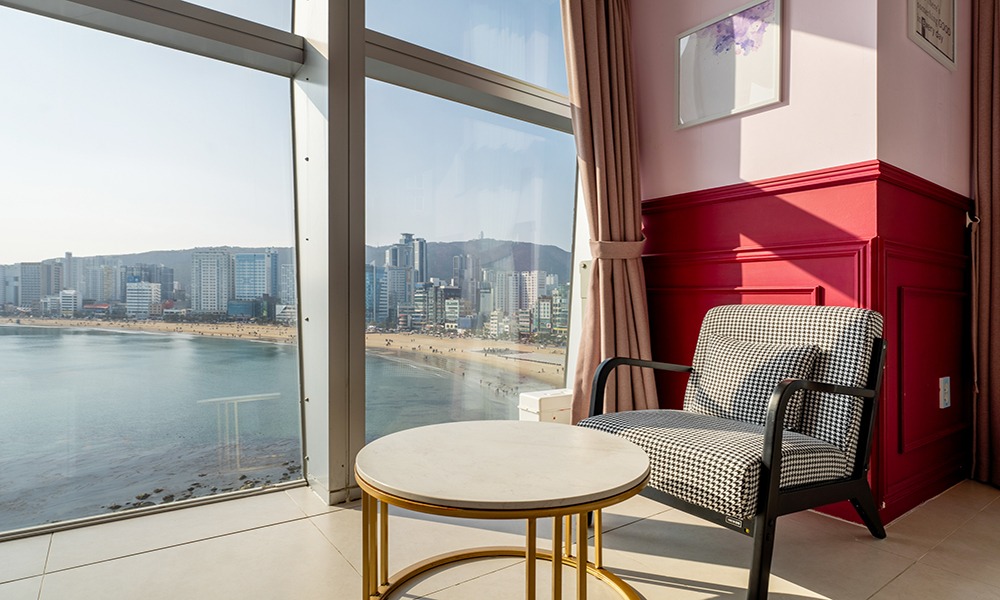 광안리 해변가 방향으로 탁 트인 파노라마 오션뷰를 감상할 수 있는 객실입니다.
